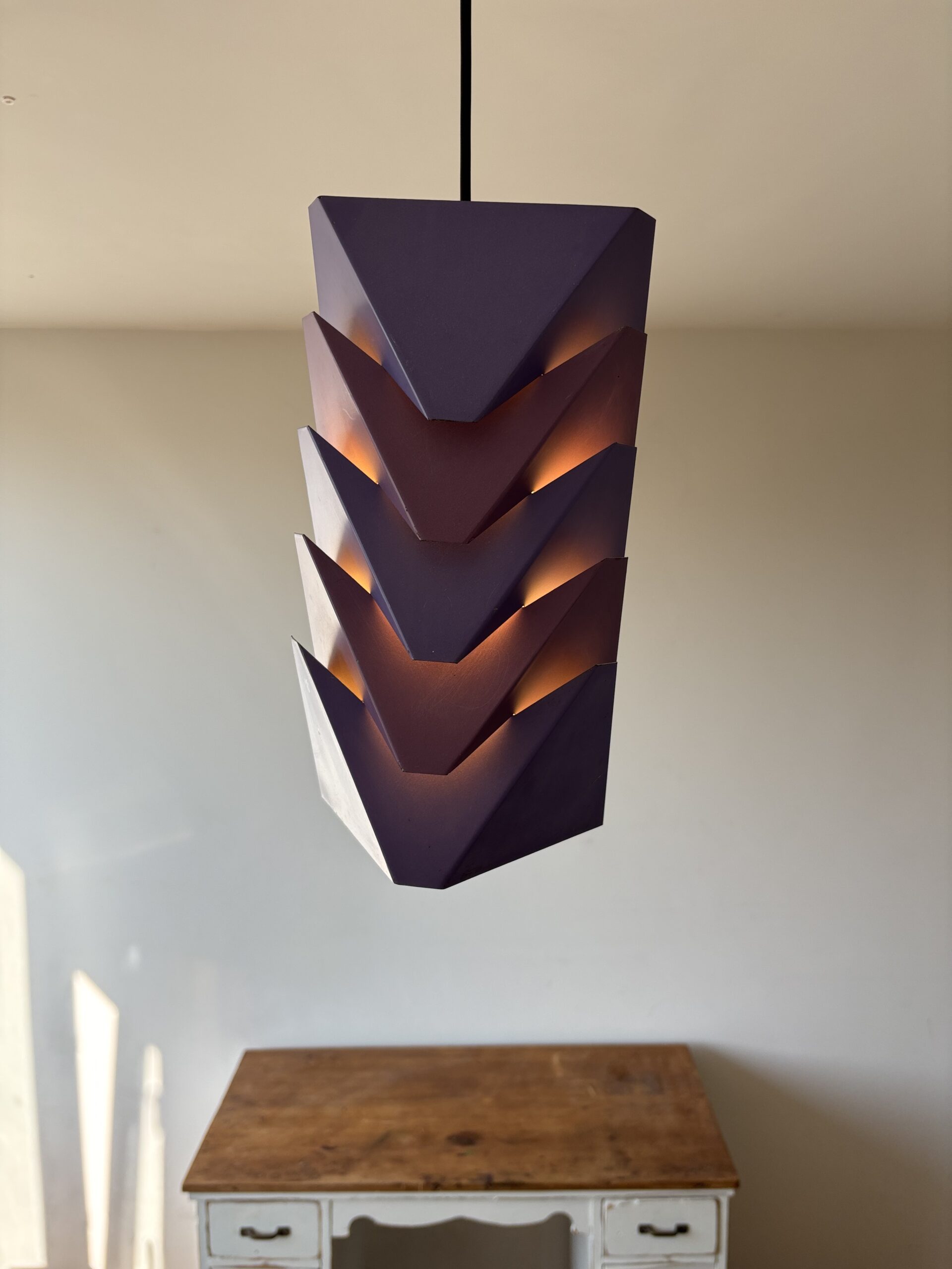 Ekko is another of Louis Weisdorf’s designs based on repeating – or echoing – elements. The layered triangular elements completely shield the eye from glare, while narrow beams of light escape to spread across the shade itself and highlight its angular sculptural form, adding to the lamp’s central downward illumination.