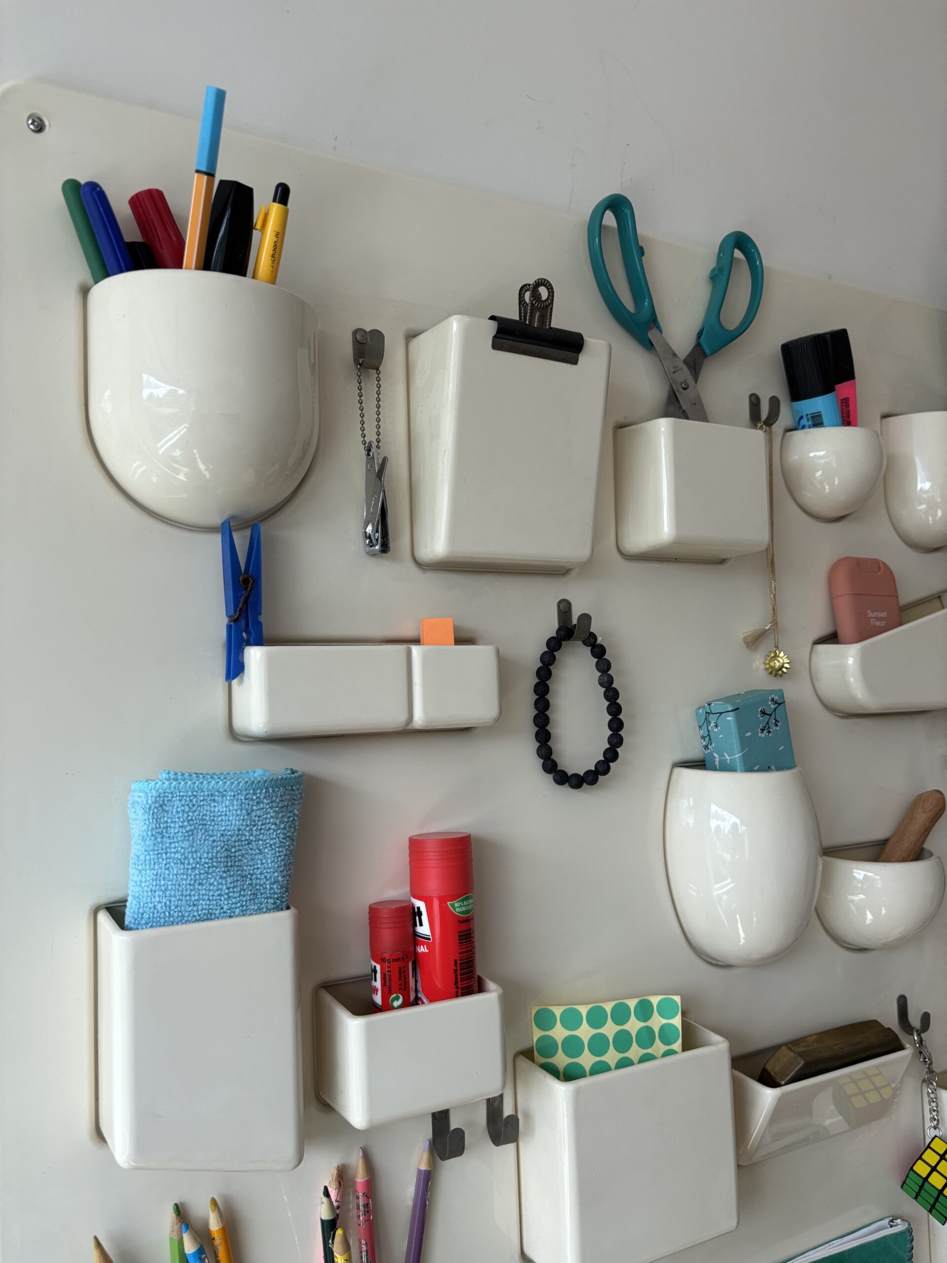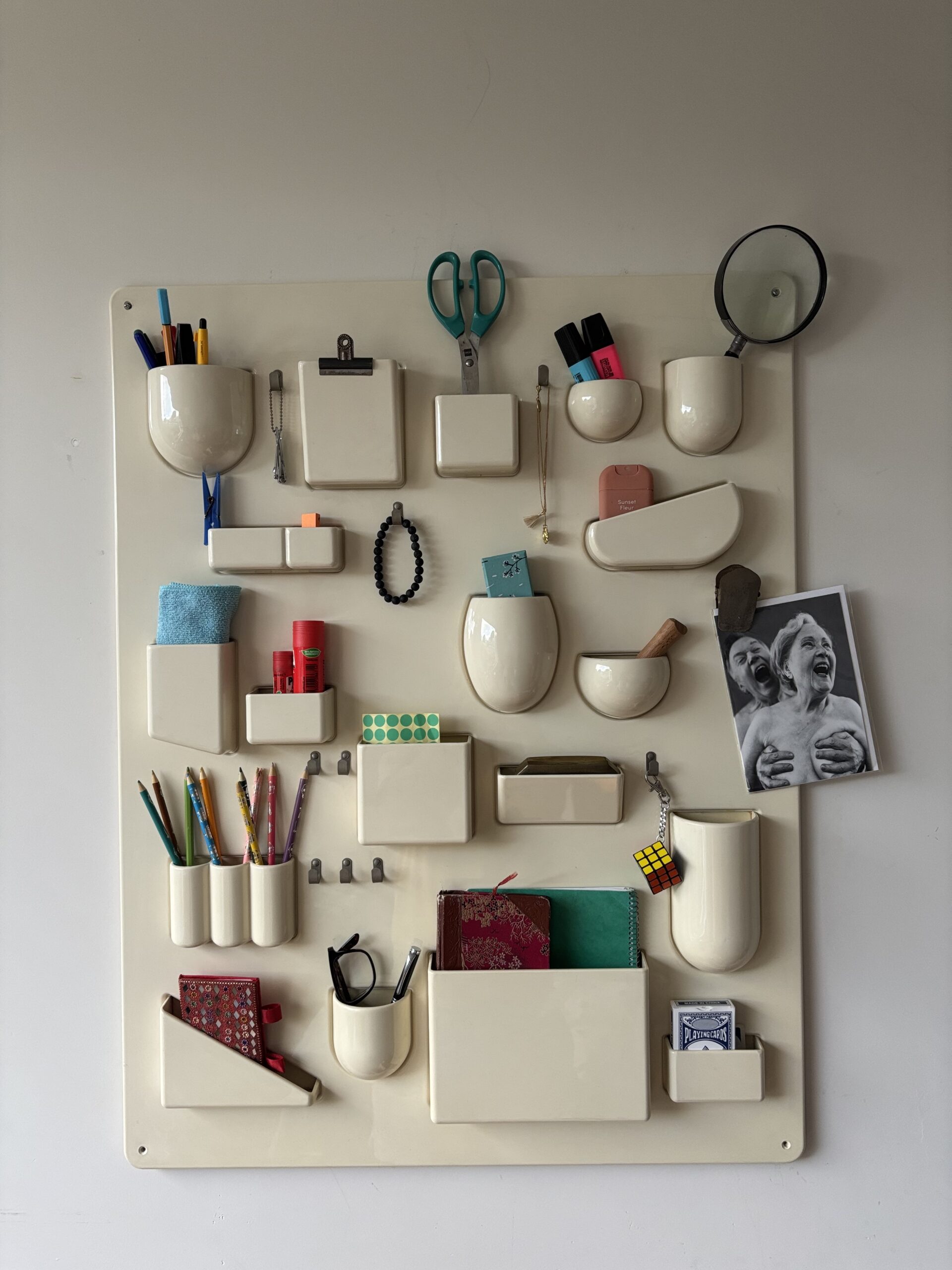 Easy to hang up, easy to organise thanks to the many compartments and hooks. With storage compartments in different shapes and sizes, metal hooks and clamps, it creates order in the office, in the kitchen, in workshops, in bathrooms and children’s rooms.
